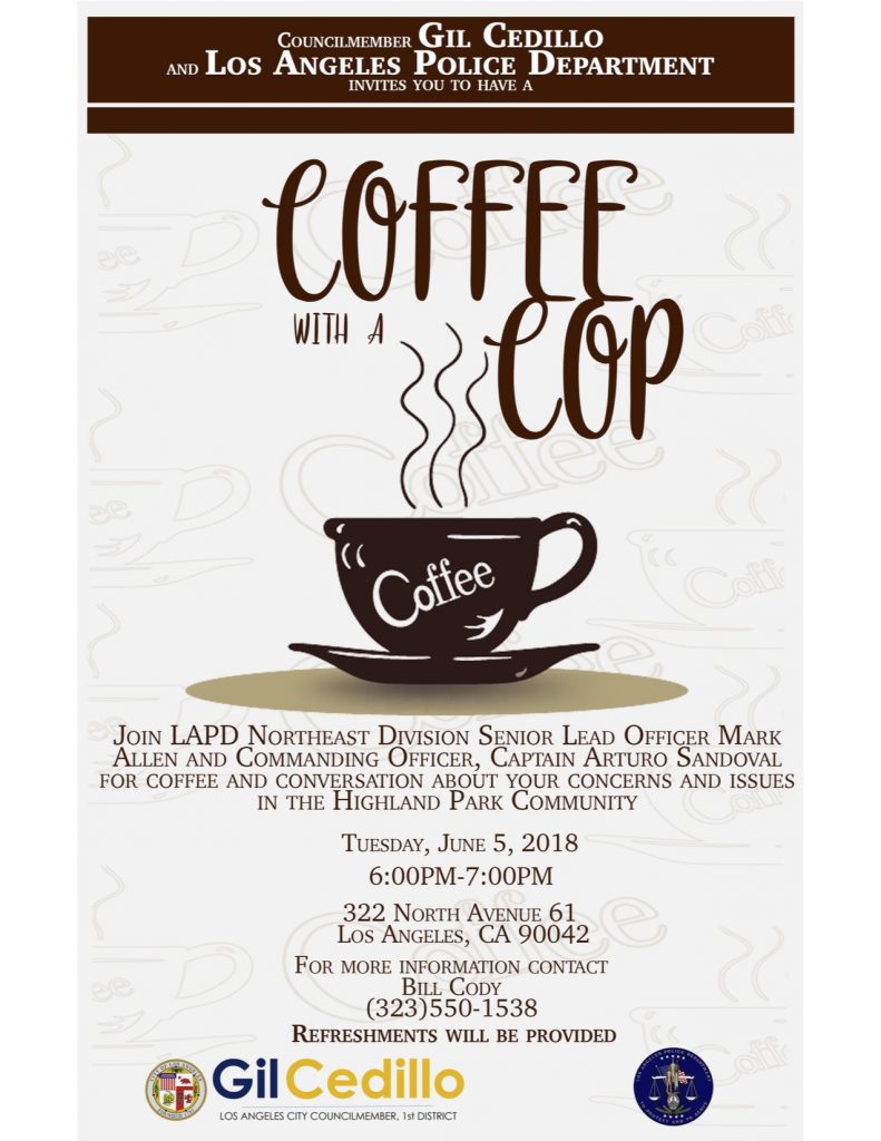Councilmember Gil Cedillo & the Los Angeles Police Department invite you to “Coffee with a Cop” on Tuesday June 5th at 6:00 pm. The location will be at 322 North Avenue 61 Los Angeles.
